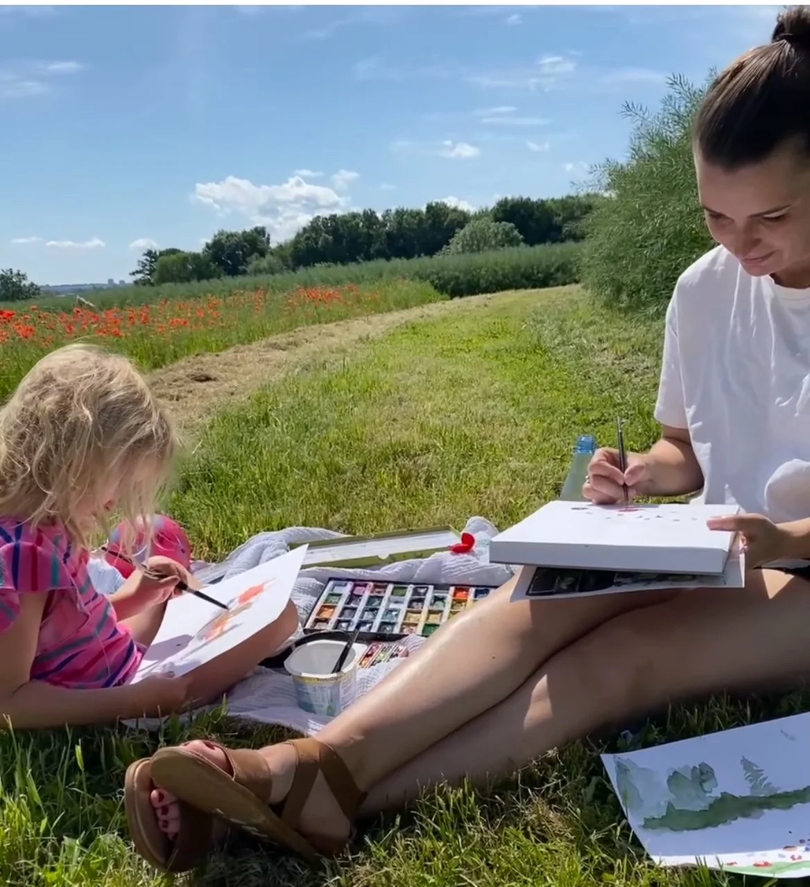 On the weekends, I’d bring watercolors out to plein air paint and a picnic for the girls, attempting to capture how the wind moved the flowers among the grass. Each angle a new perspective, experience and exploration. The symmetry was soft, the colors playful, and the wildflowers — poppies, cornflower, daisies and phacelia — seemed to spill over themselves like they were each vying for the spotlight. I took the inspiration home to my little top floor studio with the light pouring in and onto my canvas from the skylight and painted ladies perched on and surrounded by poppies.